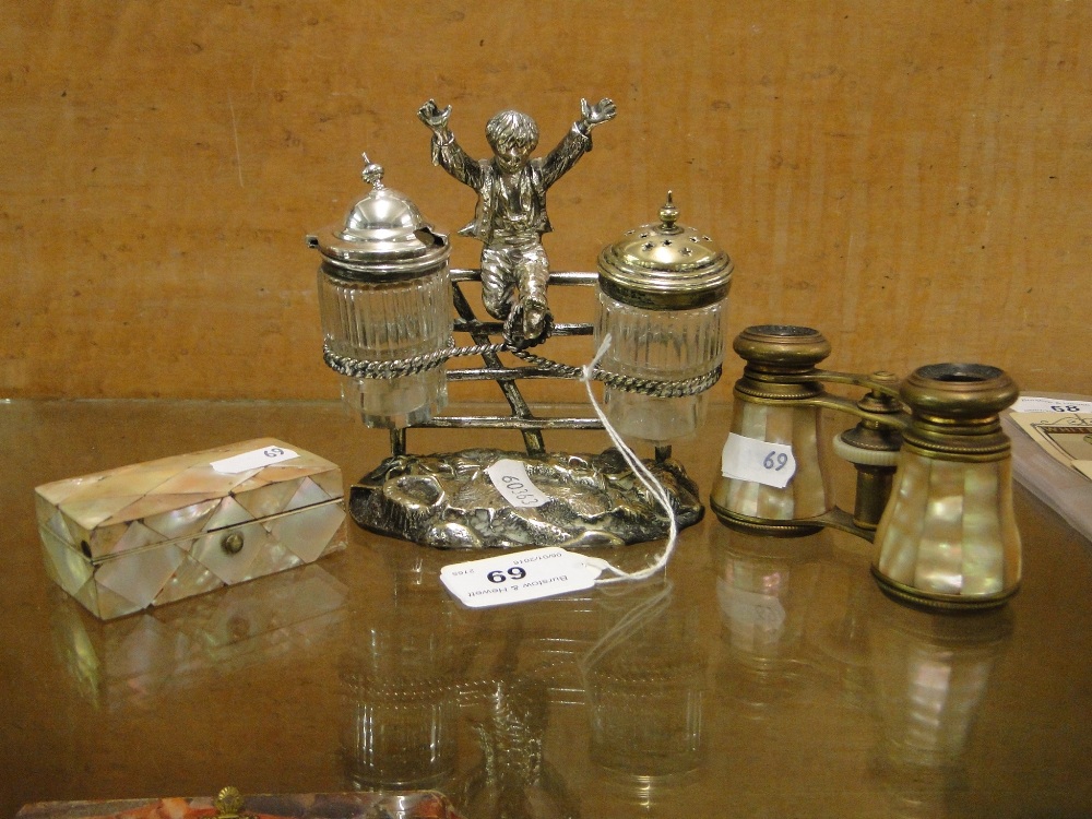 Plated cruet with child figure, mother of pearl clad opera glasses and box.