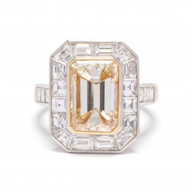 The emerald cut diamond (11.19 x 7.45 x 5.50mm) weighing 4.07 carats (actual) (U-V color, VS1 clarity) bezel set in yellow gold and framed by square and tapered trapezoid cut diamonds channel set in the platinum mount and to shoulders weighing 2.43 t
