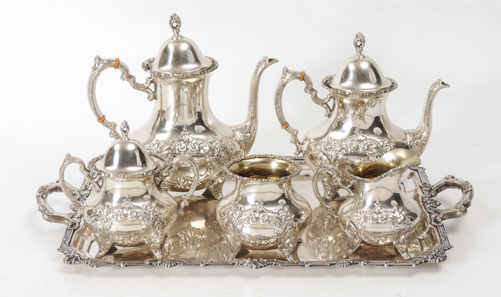 6 pieces total, 5 in the ''Crest of Windsor'' pattern by Poole to include 1) Coffee pot with hinged lid, 10 3/4'' h. x 11''. 2) Teapot with hinged lid, 9 1/2'' h. x 10''. 3) Covered sugar, 7'' h. x 7 1/2''. 4) Open creamer, 5'' h. x 5 1/2''. 5) Open