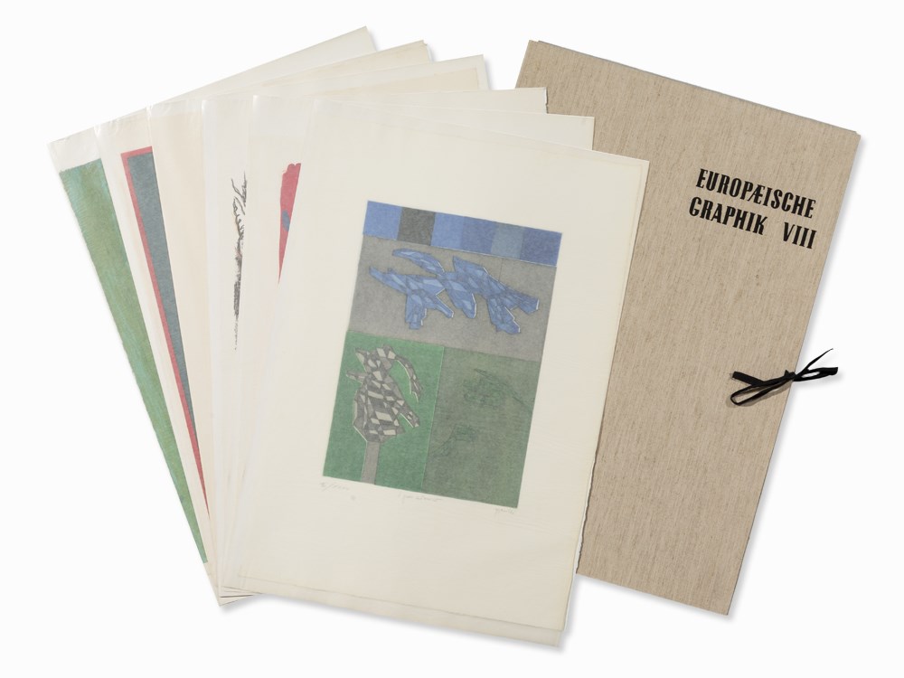 Complete portfolio comprising 5 lithographs in colors on Japon nacre and 2 aquatints in colors on wove paper. 7 plates each in cardboard-glassine-folder and together with justification sheet in natural colored linen-covered portfolio Sheet dimensions