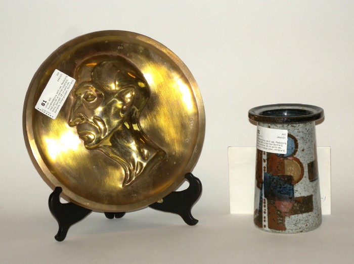 Medallion with portrait of Herman Gotthard, bronze, diameter 28 cm and vase, stoneware, throws Group, Rörstrand