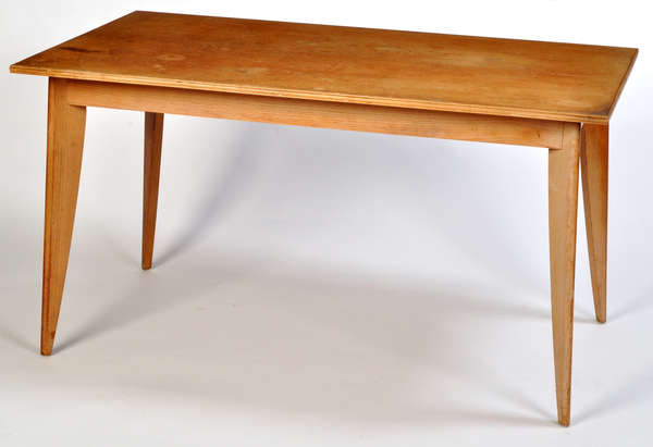 Post war design oak dining table, the rectangular top with reeded edge, raised on tapering legs