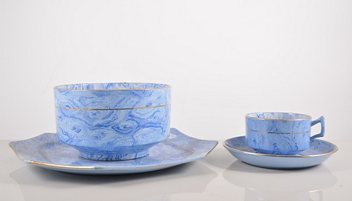 Pottery part tea set, blue marbled decoration, comprising bowl, six cups, twelve saucers, twelve plates and two sandwich plates.