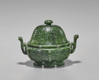 Archaistic Chinese carved spinach jade covered censer; the flattened globular body flanked by a flared handle at each side; showing taotie masks amid scrolling animal forms, rendered in light relief; the thinly carved domed cover similarly decorated,