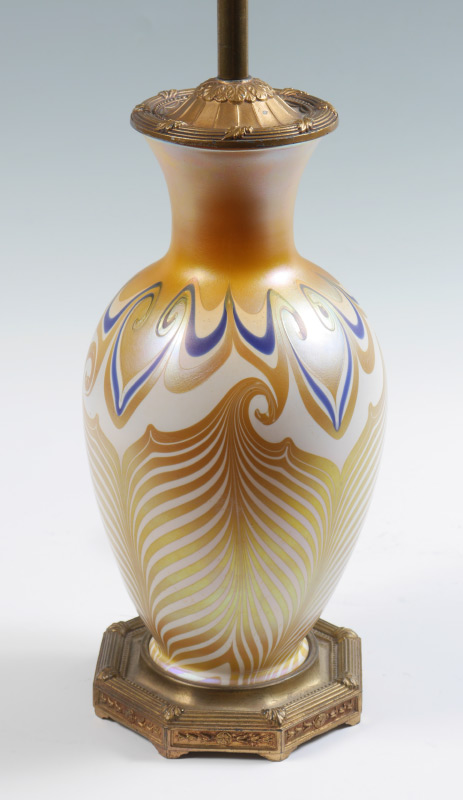 Attributed Quezal iridescent art glass body with pulled feather design ending in swirls. Gilt metal base marked M. S. Co.