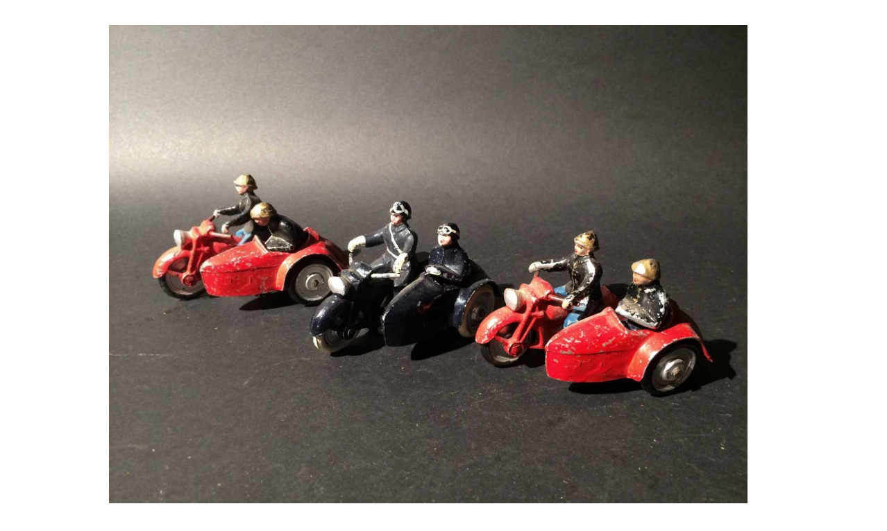 QUIRALU, Lot 3 motorcycle side cars with driver and passenger, two motorcycle sidecar firefighters, a motorcycle sidecar aluminu