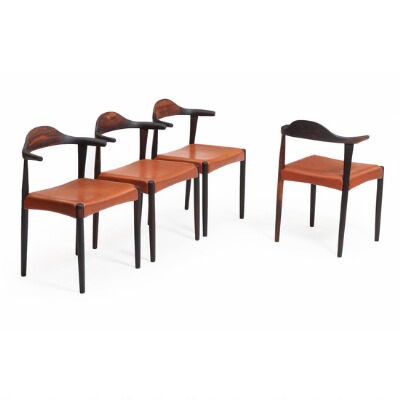 Set of four rosewood armchairs. Seats upholstered with cognac colored leather. Model 69. Manufactured by Randers Møbelfabrik. (4)