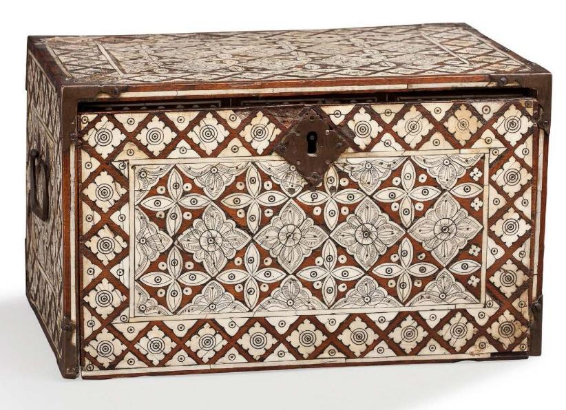 Rectangular box in teak veneer and incrustations of ivory, decorated with quartets and geometric patterns. It opens by a flap discovering seven drawers. The sides are fitted with brass drop handles. Work Indo Portuguese, Gujarat or Sindh, XVIIIth