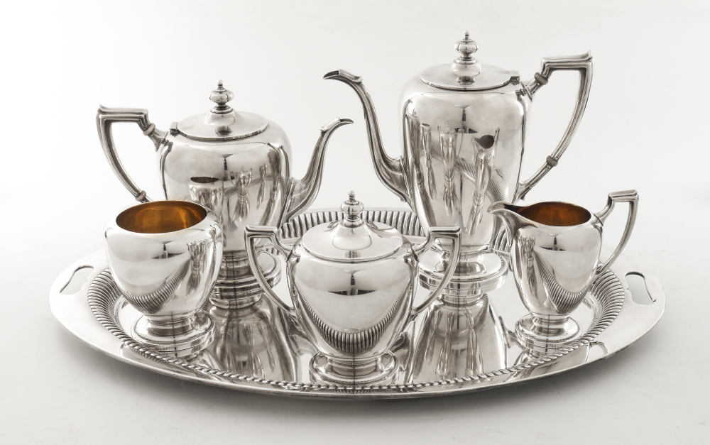5 pieces in the Pointed Antique pattern by Reed & Barton, date marks for 1945 & 1946, to include 1) Coffee pot, 9 1/2'' h. x 10''. 2) Teapot, 7 3/4'' x 9 1/2''. 3) Covered sugar, 6 1/4'' h. x 6 3/4''. 4) Open creamer, 5 1/4'' h. x 5 1/8''. 5) Open wa