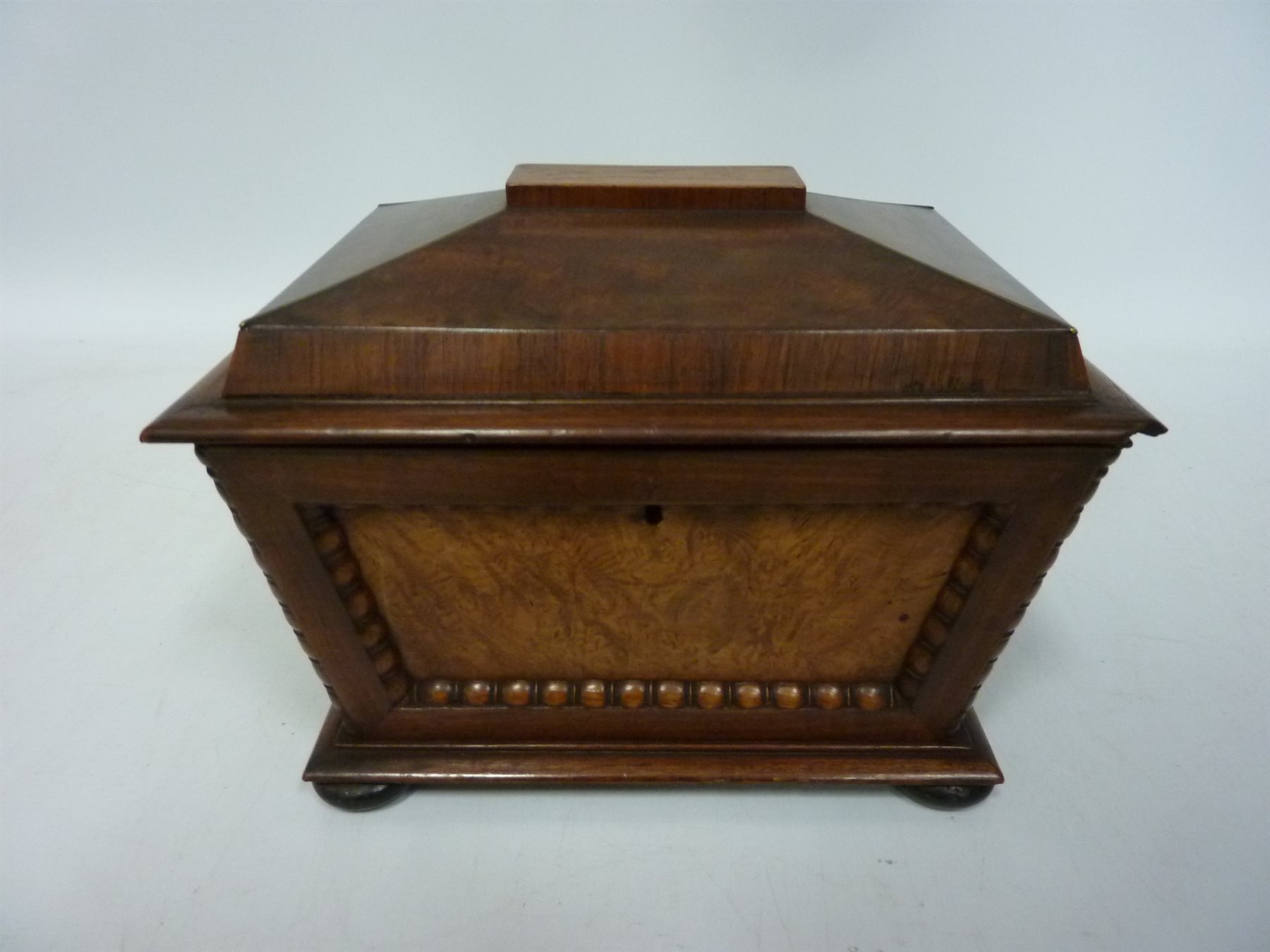 Regency period sarcophagus shape mahogany work box with rosewood banding and figured walnut panels