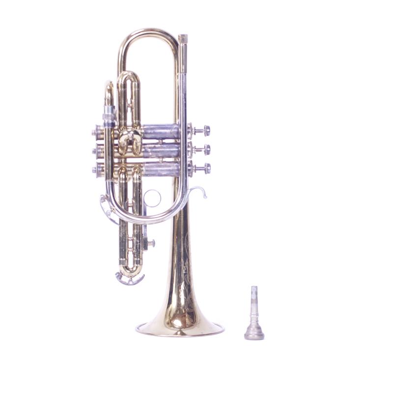 Reynolds engraved trumpet in case with Bach mouthpiece.