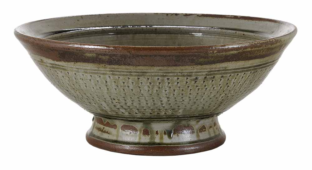 footed coupe-shaped stoneware bowl with celadon-green glaze, not signed