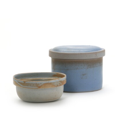 Oval lid bowl and a small bowl of resp. blue and white stoneware mass. Decorated with resp. bluish purple and pale bluish grey glaze. Signed Richard Manz. Unique. Lid bowl; H. 10,5 cm. W. 11,5 cm. L. 14,5 cm. Bowl: H. 5,8 cm. W. 10,6 cm. L. 12,5 cm.