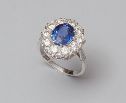 centered with an oval sapphire weighing 3.16 carats with his laboratory's expertise GRS report of 23 February 2011 in a row of shiny diix between two palms diamond, diamonds total: 1 60 carat about, size: 56, weight: 5,54gr. gross