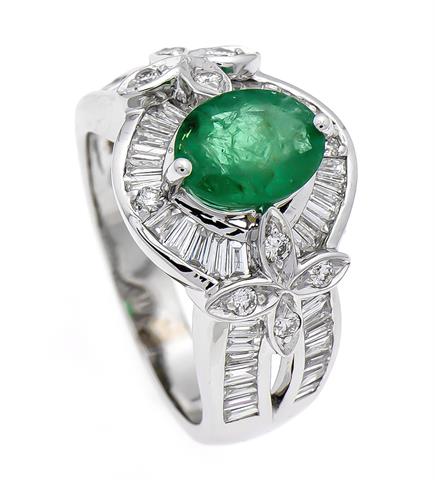 Smaragd-Brillant-Ring WG 750/000 mit einem feinen oval fac. Smaragd, zus. 1,61 ct in guter Farbe und Reinheit sowie 10 Brillanten, zus. 0,17 ct und 51 Diamant-Baguettes, zus. 0,88 ct W/VS-SI, RG 54, 8,9 g