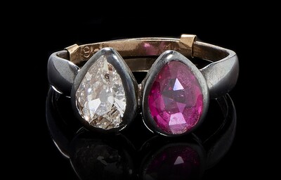 Ring "you and me" set with a ruby (about 0.6 ct) and a diamond (about 0.6 ct), each size old pear