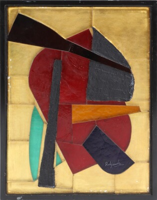 Coloured glass and concrete mounted in iron frame.