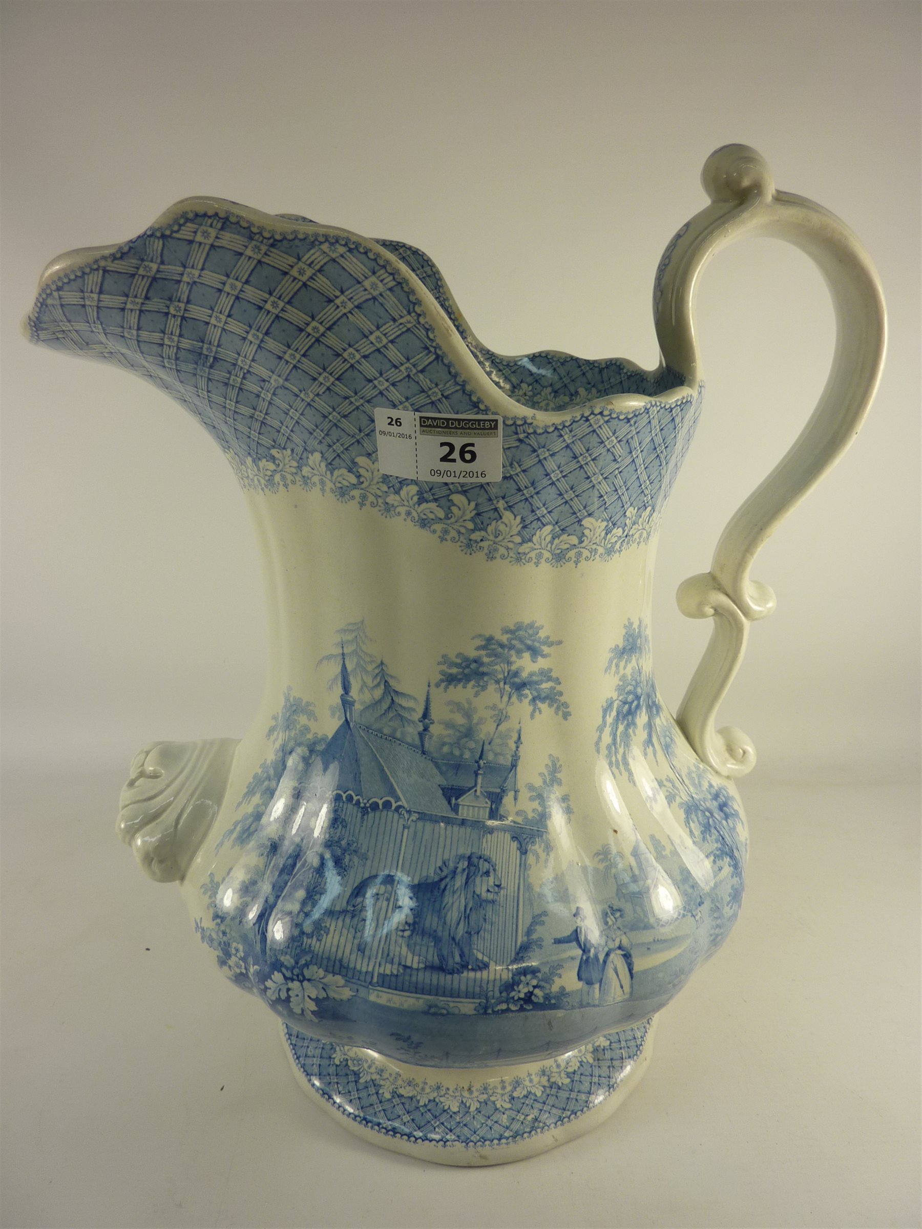 Robinson, Wood & Brownfield blue and white stoneware jug in the 'Zoological' pattern c.1837 H38cm