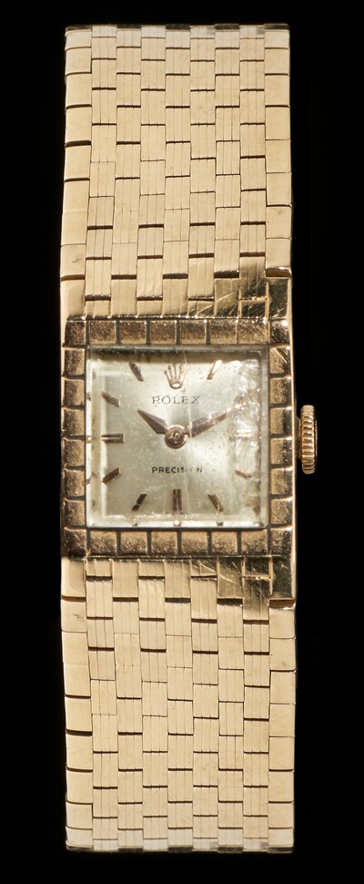 Gray dial, gold stick hands and hour markers, 750 gold, 16x16 mm, L between 15.5 and 18.5 cm, gross weight 71 g