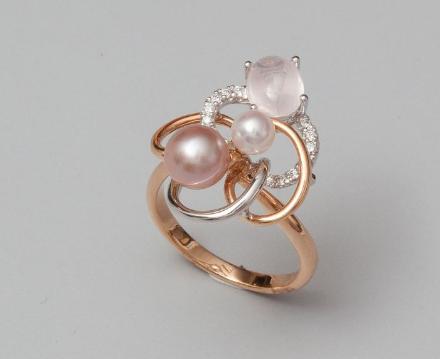 Rose gold ring, 750 MM, decorated with pearls, quartz pearl and diamond size: 54 Weight: 5,2gr. gross