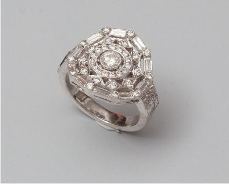 covered with baguette-cut diamonds and brilliant cut total: 1.30 carat approx size: 53 Weight: 8,4gr. gross