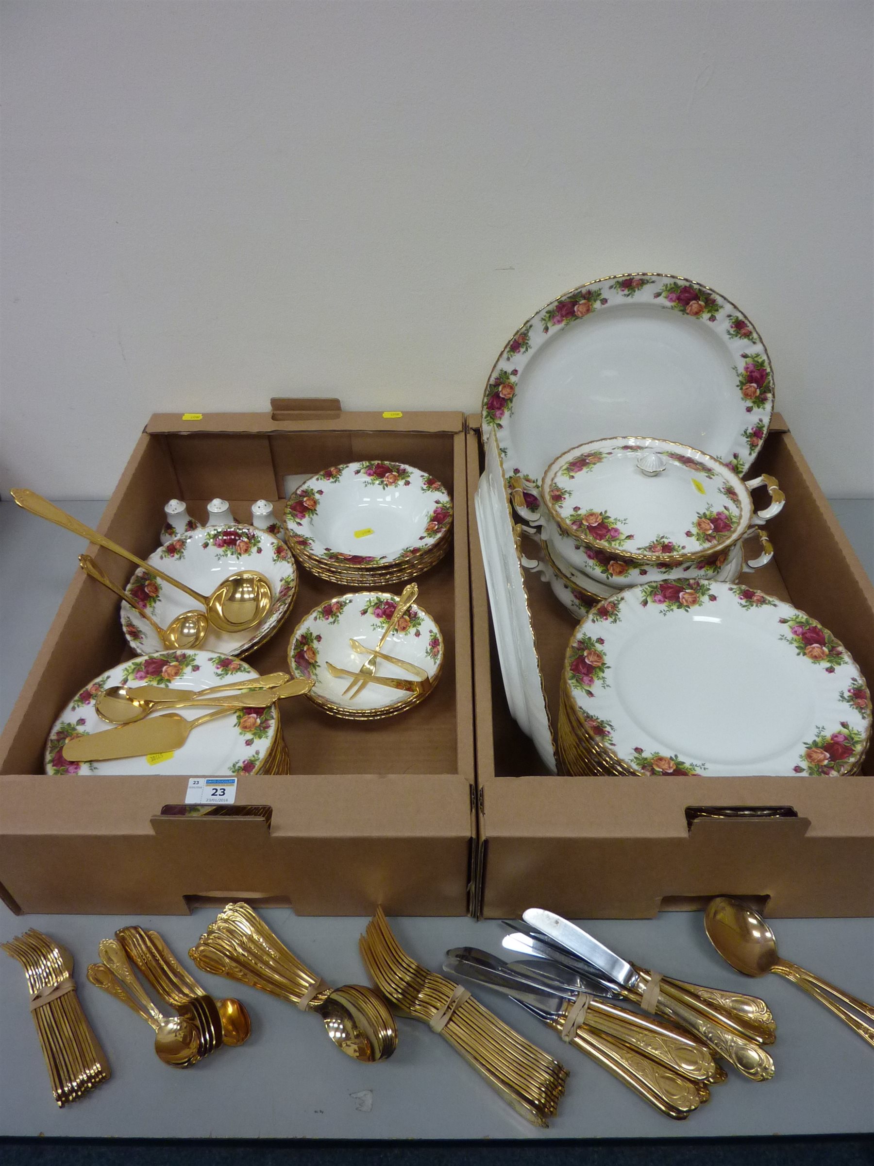 Royal Albert 'Old Country Roses' dinner service, and a canteen of SBS Rostfrei Edelstahl gold plated cutlery in three boxes