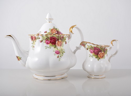 comprising teapot, six cups, five saucers, six side plates, milk, sugar, oval cake plates and rectangular dish.