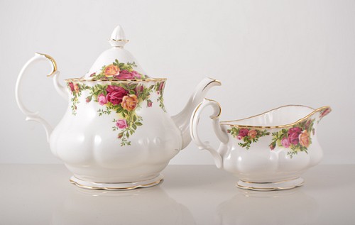 comprising of one tea pot, six tea cups, six saucers, one sugar bowl, six soup dishes, twelve side plates, six tea plates, two milk/cream jugs, one gravy boat, seven dinner plates, one side dish, one meat plate serving, one serving plate, first and s