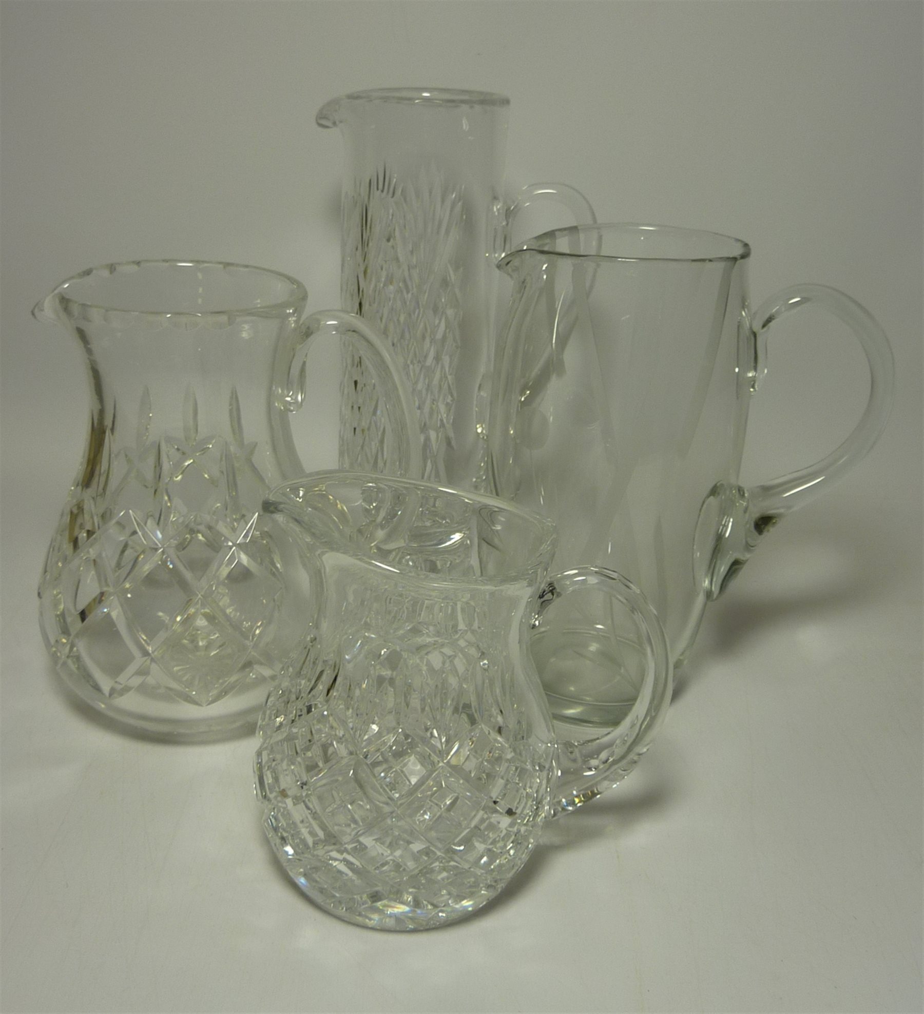 Royal Brierley, Royal Doulton, Edinburgh crystal water jugs and one other with etched decoration