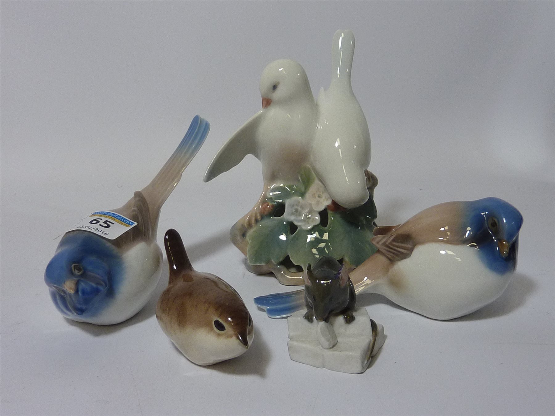 Royal Copenhagen dove group and mouse, Bing and Grondahl birds 'Optimist and Pessimist' and a USSR type bird (5)