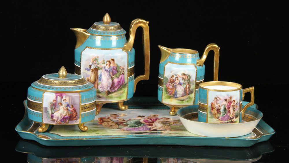 Royal Vienna tea service, to include: tray, teapot, creamer, sugar, cup and saucer