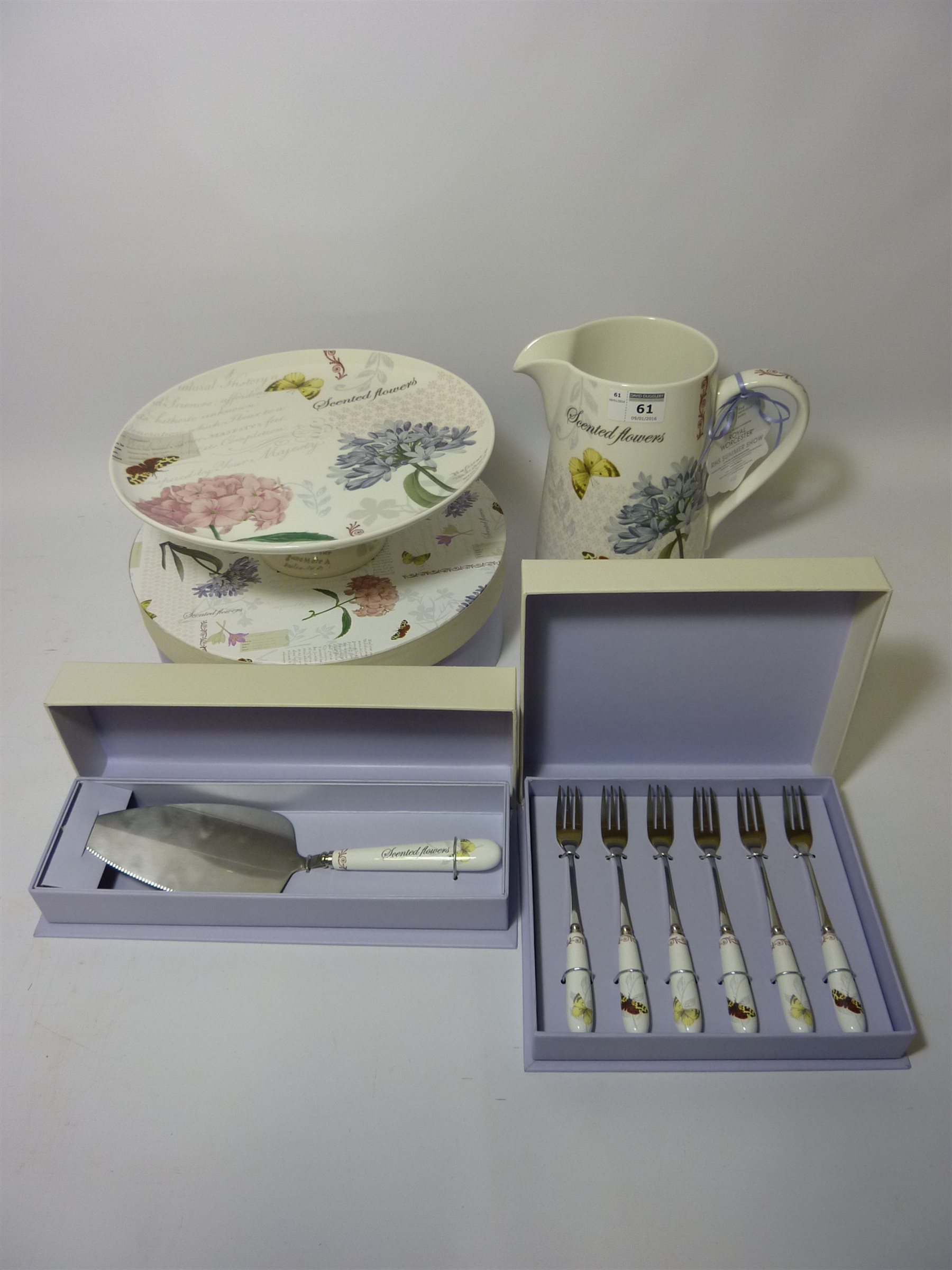 Royal Worcester 'Scented Flowers' jug, cake stand, cake slice and set of six pastry forks