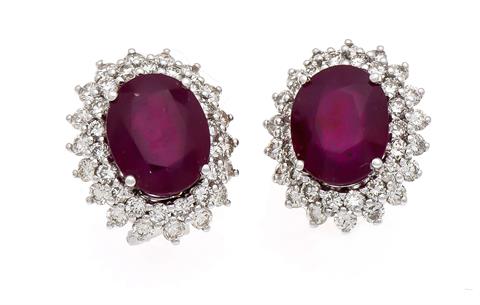 Rubin-Brillant-Ohrstecker WG 750/000 mit je einem feinen oval fac. Rubin, zus. 9,75 ct in guter Farbe und Reinheit sowie 72 Brillanten, zus. 2,38 ct W/VS-SI, L. 18 mm, 9,2 g