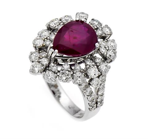 Rubin-Brillant-Ring WG 750/000 mit einem feinen tropfenförmig fac. Rubin 3,30 ct in sehr guter Farbe und Reinheit sowie 54 Brillanten, zus. 1,68 ct TW/VS-SI, RG 54, 6,4 g