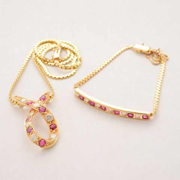 Including one ruby, diamond, 14k yellow gold ribbon motif pendant, suspended from a 14k yellow gold 15 1/4 inch neck chain together with a ruby, diamond, 14k yellow gold 6 inch bracelet. Total diamond weight for the suite is approximately 1.30 cttw.