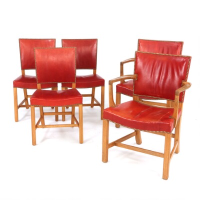 A set of five chairs of oak. Upholstered with red leather