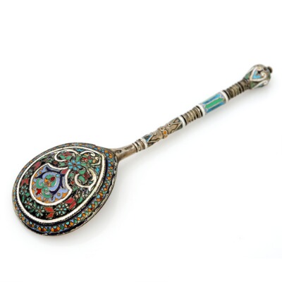 Russian silver and cloisonné enamel spoon, gilt bowl