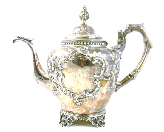 floral and scroll repousse decoration, domed lid with scrolled finial, monogrammed "WMB," four pierced feet, two bone accent rin
