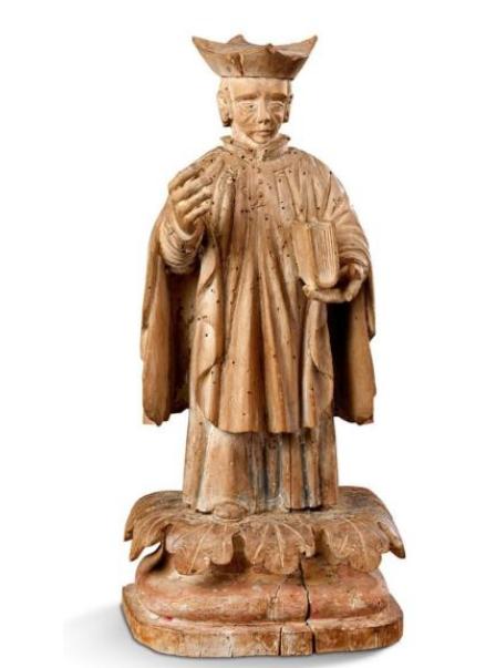 in soft wood It is depicted holding a book of the left hand resting on a foliage capital, dressed in the toga and wearing the toque of doctor. West of France late 17th - early 18th century.