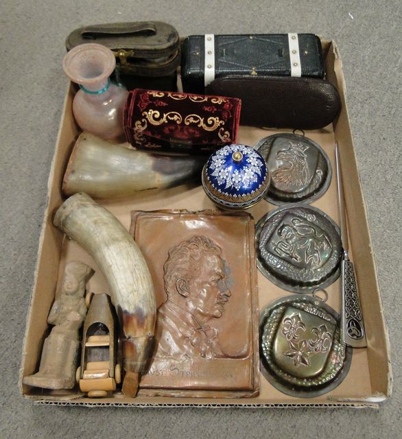 Samlarlåda bl.a. teaterkikare, miniatyrkista med sytillbehör, bonbonjär
