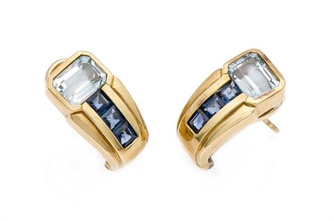 Saphir aquamarine clip earplug GG 750/000 with a fine fac. Aquamarine 7 x 5 mm and 3 fac. Fine sapphires in very good color, L. 17 mm, 8,8 g