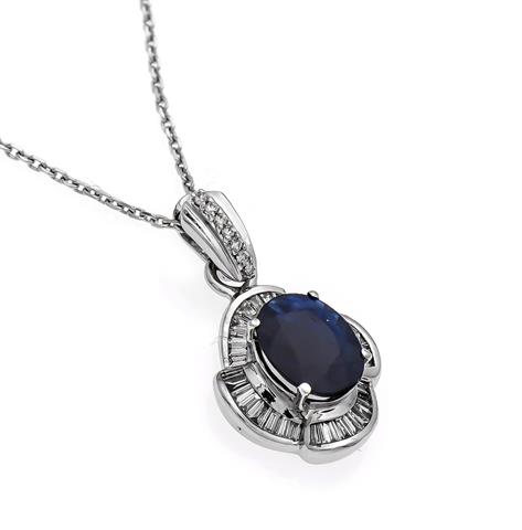 Saphir-Brillant-Anhänger WG 750/000 mit einem feinen oval fac. Saphir 2,48 ct in guter Farbe und Reinheit sowie 2 Brillanten, zus. 0,06 ct und 35 Diamant-Baguettes, zus. 0,82 ct W/VS-SI, L. 27 mm, an einer Kette WG 750/000 mit Karabiner, L. 42 cm, 7,