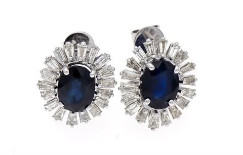 Saphir-Brillant-Ohrstecker WG 750/000 mit je einem feinen oval fac. Saphir, zus. 3,75 ct in guter Farbe und Reinheit sowie 36 Diamant-Trapezen, zus. 1,34 ct W/VS-SI, L. 15 mm, 4,5 g