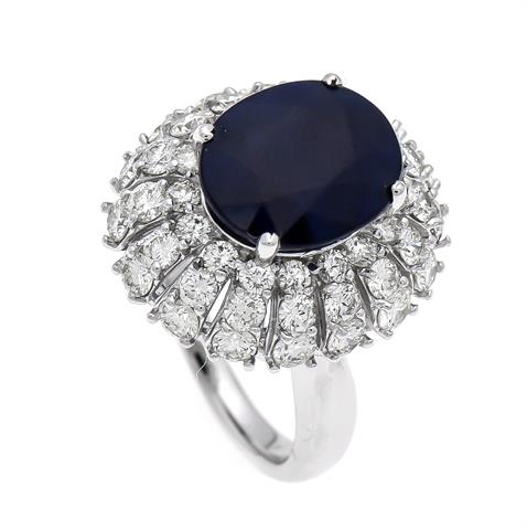 Saphir-Brillant-Ring WG 750/000 mit einem feinen oval fac. Saphir 5,01 ct in guter Farbe und Reinheit sowie 48 Brillanten, zus. 2,12 ct W/VS-SI, RG 51, 8,8 g