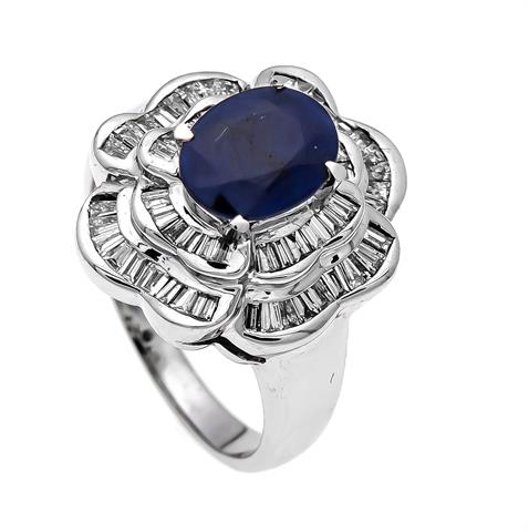 Saphir-Brillant-Ring WG 750/000 mit einem feinen oval fac. Saphir 2,25 ct in guter Farbe und Reinheit sowie Diamant-Baguettes, zus. 1,05 ct TW/VS-SI, RG 53, 9,3 g