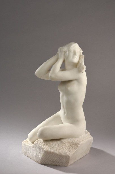 Sculpture en marbre blanc représentant une femme nue assise se coiffant.