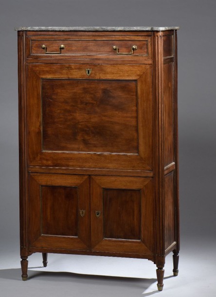 Secretary opening to a drawer, leaf and two leafs in mahogany and mahogany veneer. It has an interior with five niches and six small drawers. Uprights hollowed out of grooves, small turned feet. Brass handles, frames and doorways. Gray granite tray (