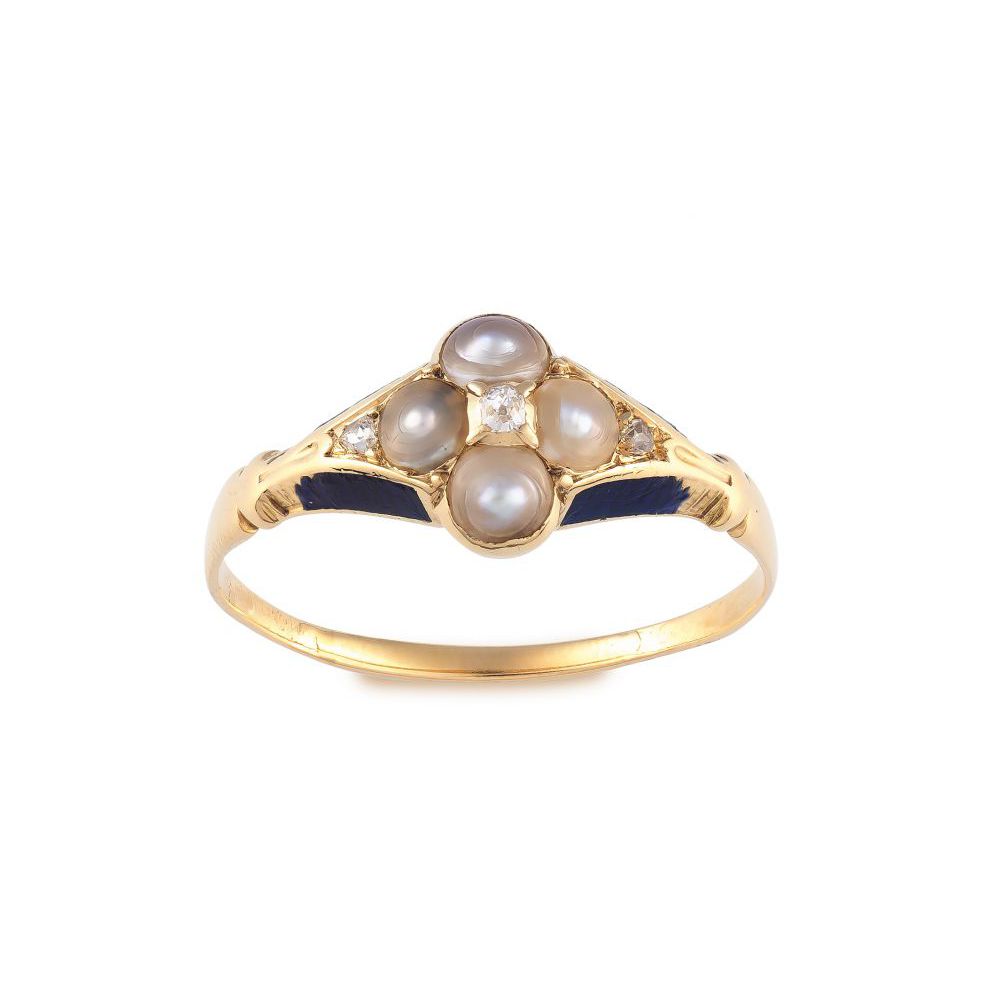 set to the front with four seed pearls accented with rose-cut and old-cut diamonds, the shoulders heightened with blue enamel, enamel damaged, size M