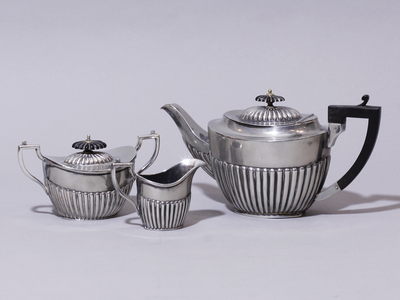Service 3 pièces en métal argenté composé d'une théière basse, un sucrier couvert et un crémier à fonds plats et godrons allongé