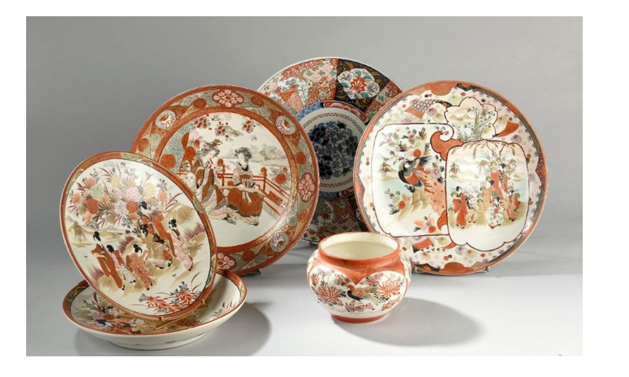 Set of five courses and a glass of white and orange porcelain decorated with plants and animated scenes